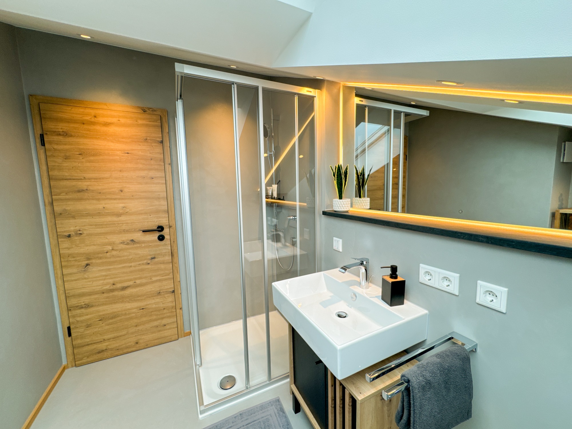 - Modernes Badezimmer: Unser Badezimmer verfügt über eine Dusche, Waschbecken und WC sowie alle notwendigen Annehmlichkeiten für Ihren Komfort.